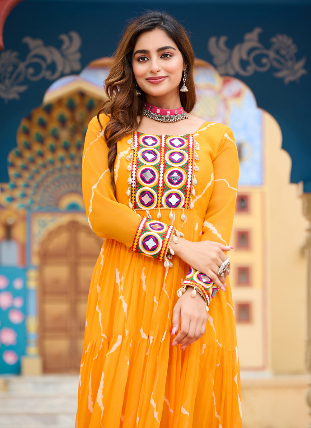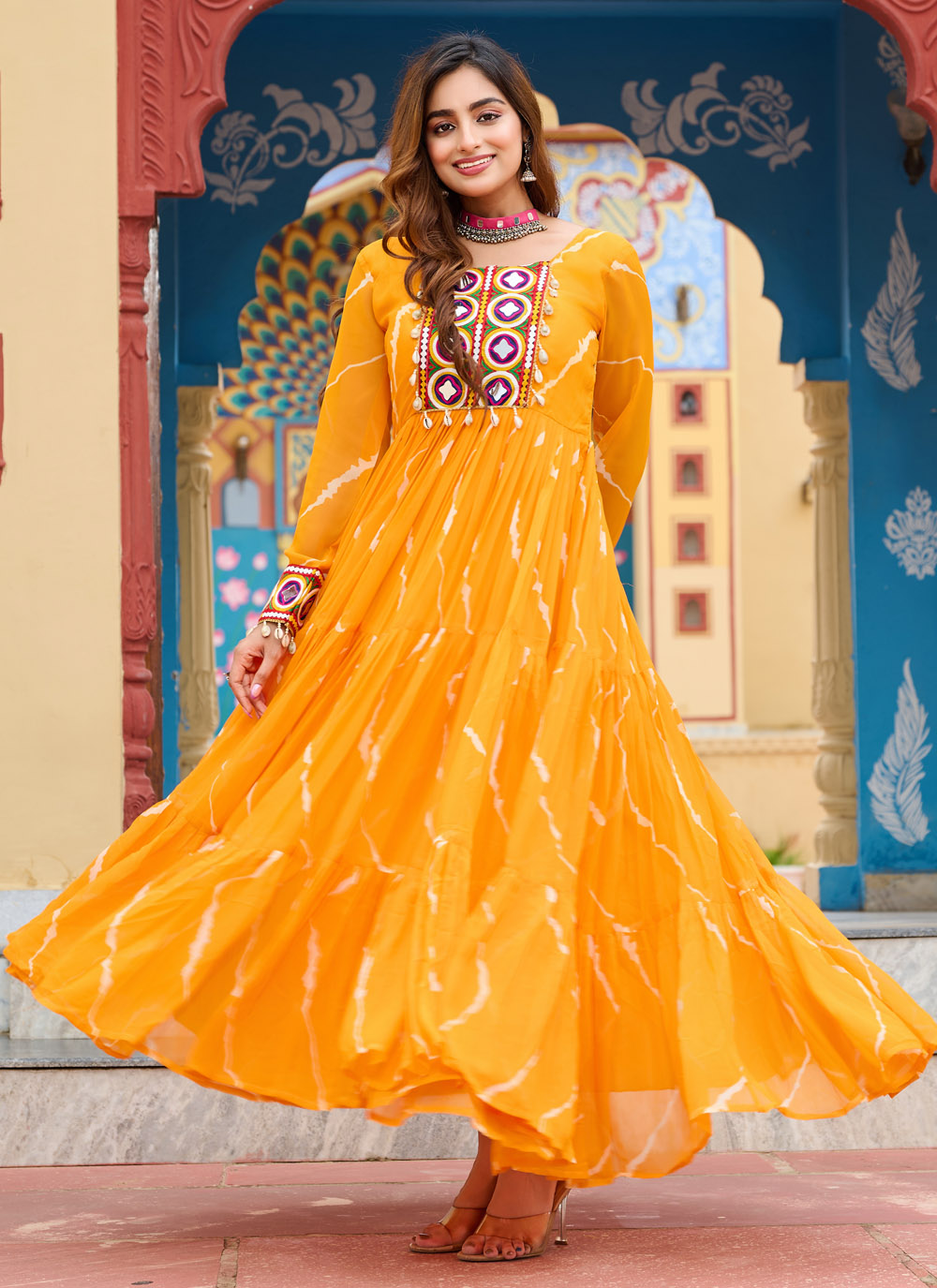 Exude elegance and liveliness with this yellow printed gown in faux georgette, beautifully enhanced with tasteful patch work. The soft texture and easy drape make it a graceful choice for a traditional function or a casual festive event.