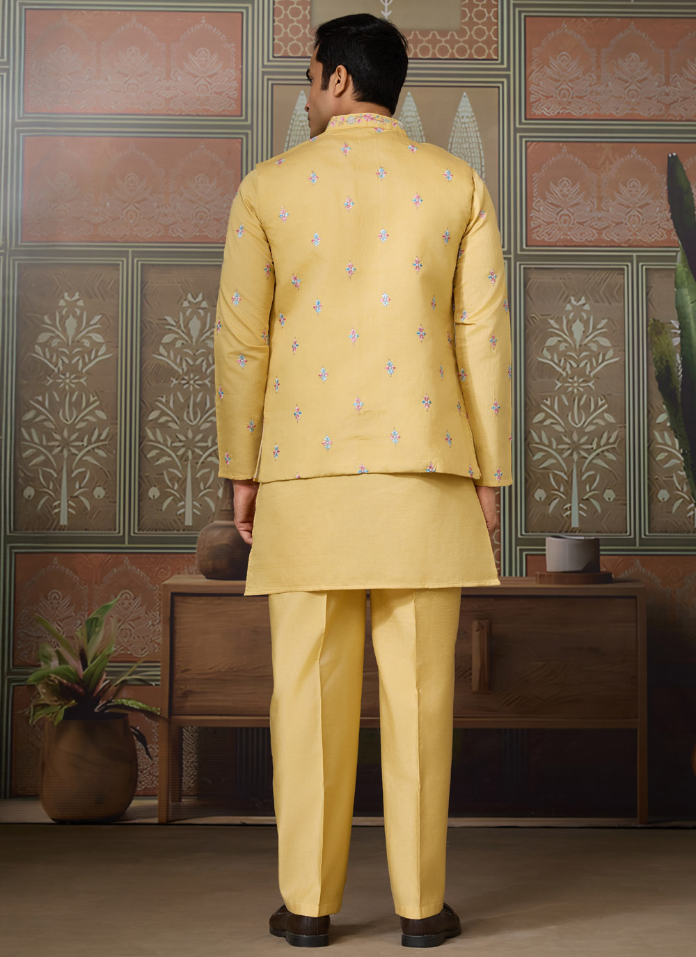 Brighten your ethnic wardrobe with this yellow viscose silk kurta pajama set. Its sequins and thread embroidery create a refined appeal, while the stylish jacket completes the ensemble with a polished touch.