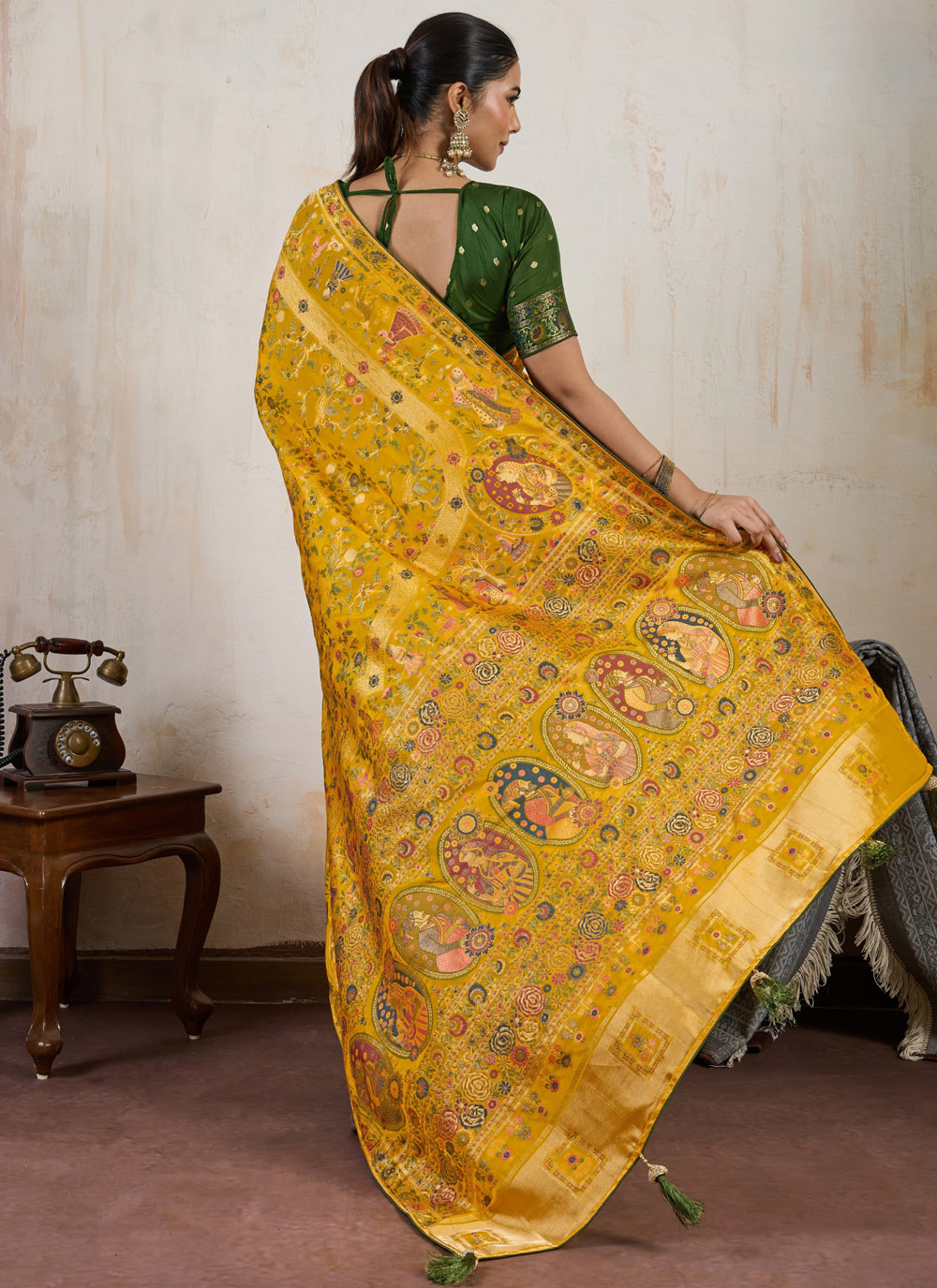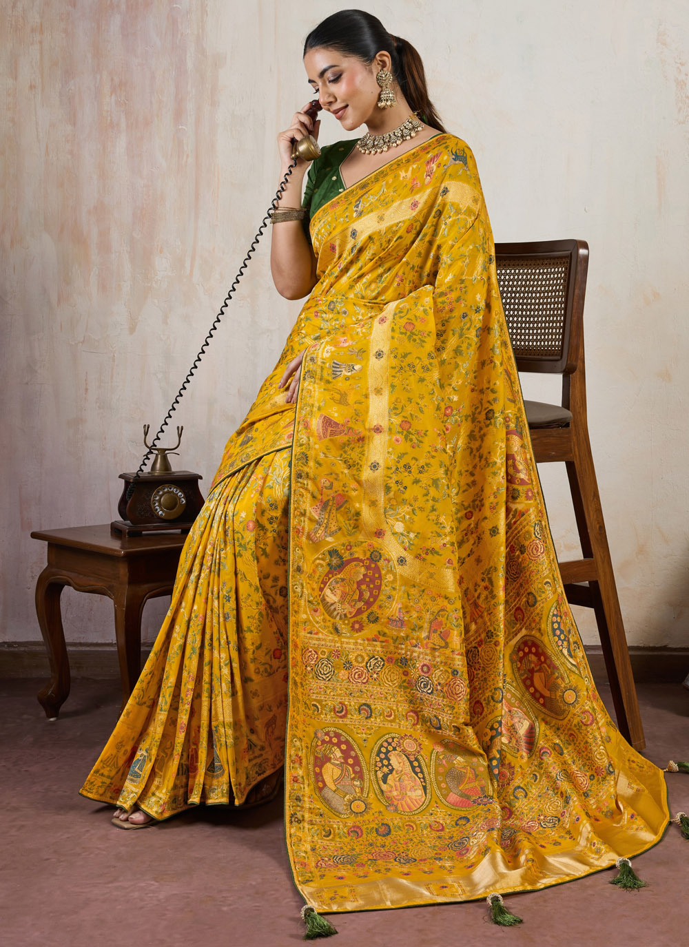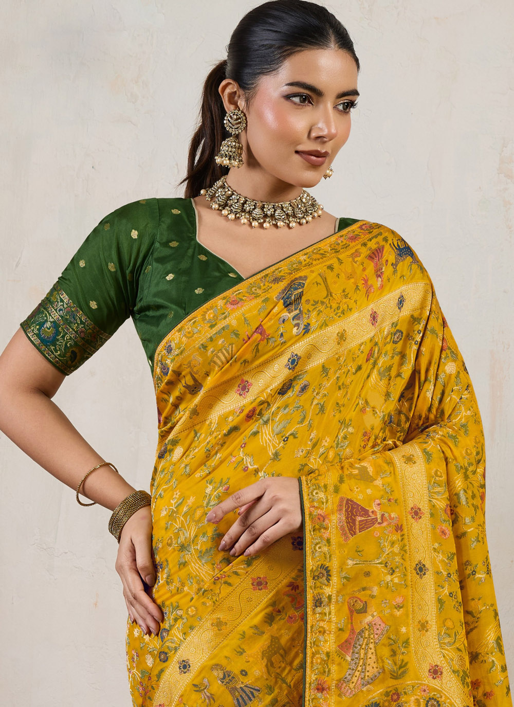 Crafted from rich silk, this designer yellow saree features ornate zari and thread embellishments highlighted with meenakari motifs. Its vibrant shade makes it ideal for weddings, receptions or grand celebrations. Comes with matching blouse.