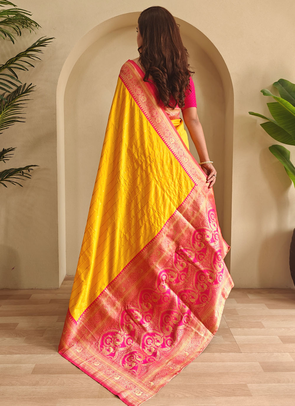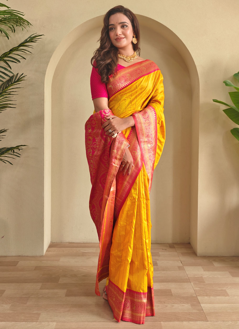 Wrap yourself in timeless beauty with this Yellow Silk Saree, gracefully adorned with intricate zari weaving work. The luminous fabric and traditional patterns make it the perfect ensemble for weddings & festivals. Comes with matching blouse.