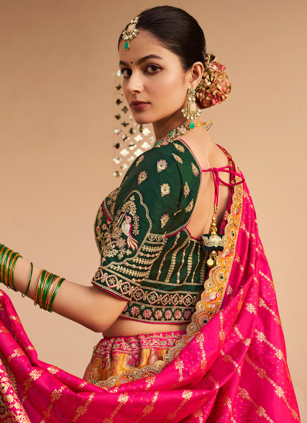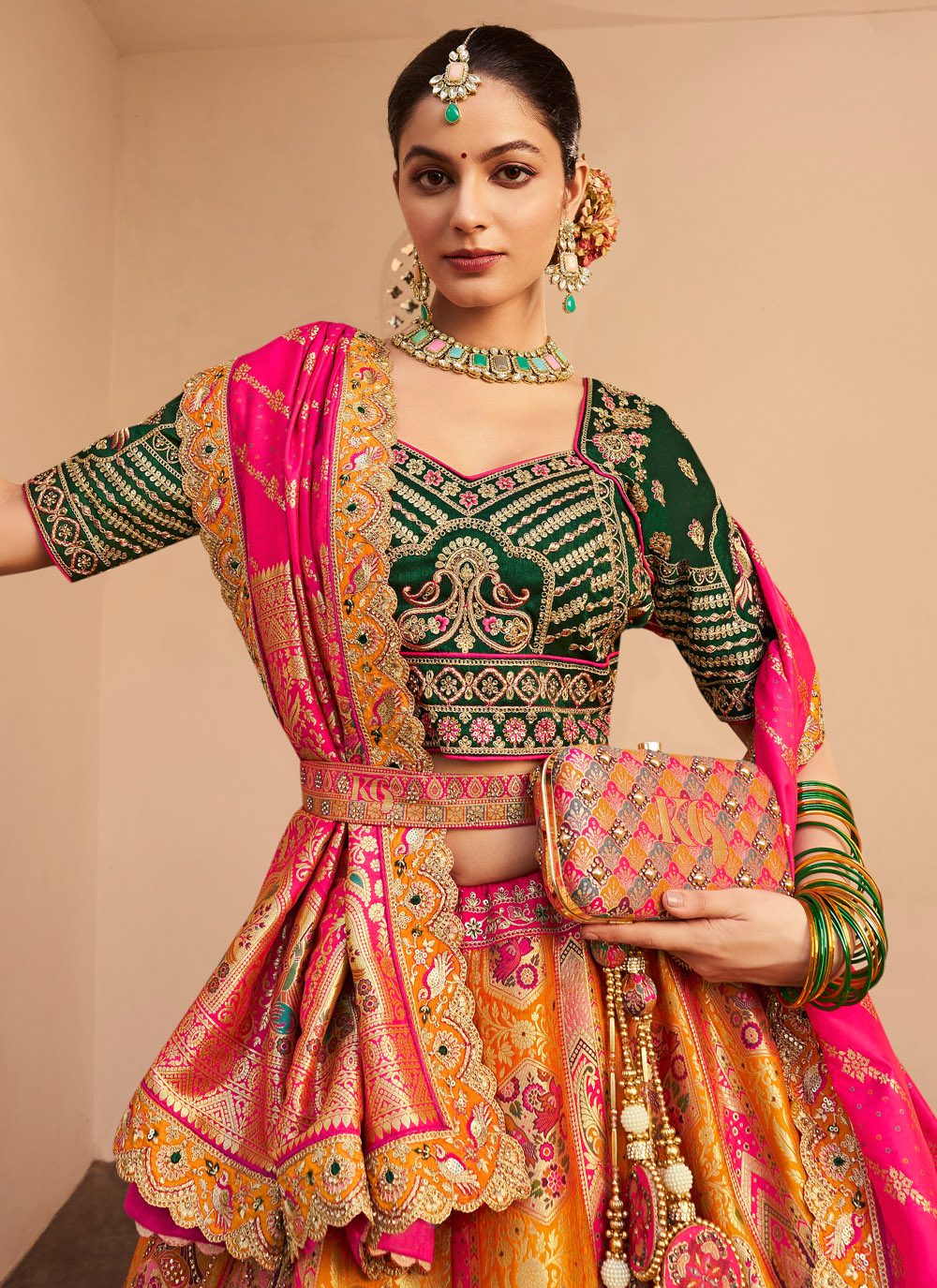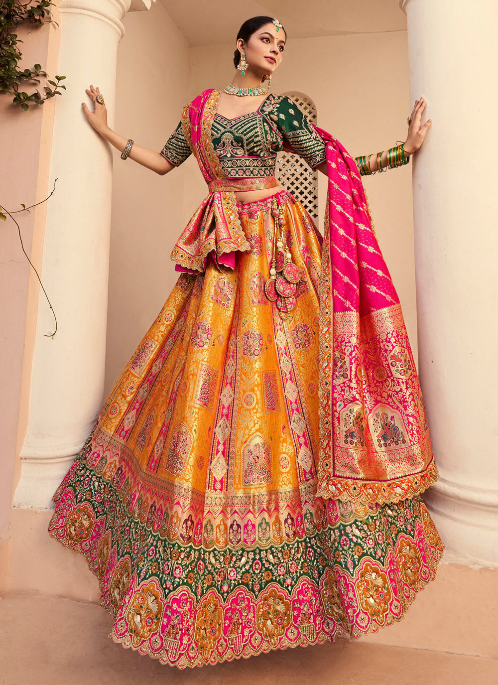 Radiate sunshine and regal charm in this yellow Banarasi silk A-line lehenga choli, a masterpiece crafted for festive and bridal elegance. Rich embroidery blends beautifully with shimmering sequins, dazzling stonework and traditional zari and thread weaving. Comes with matching choli and dupatta.