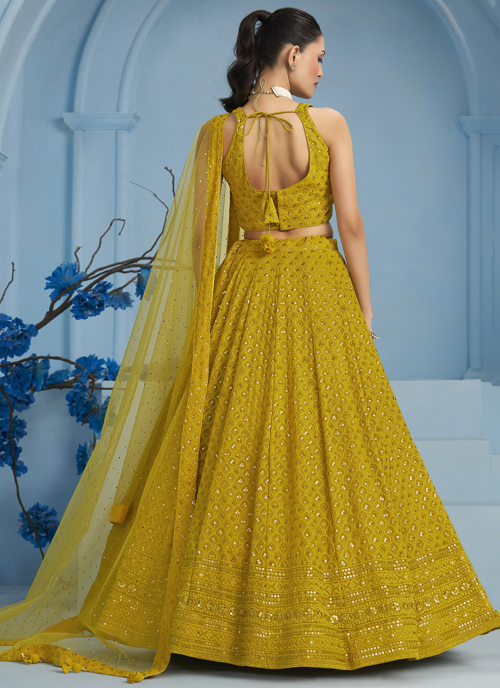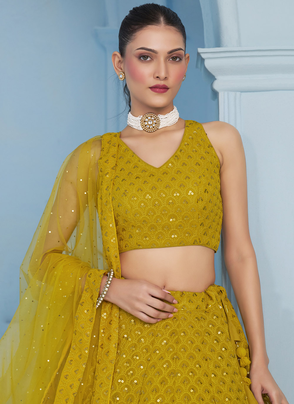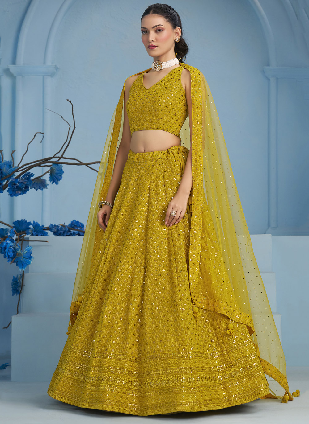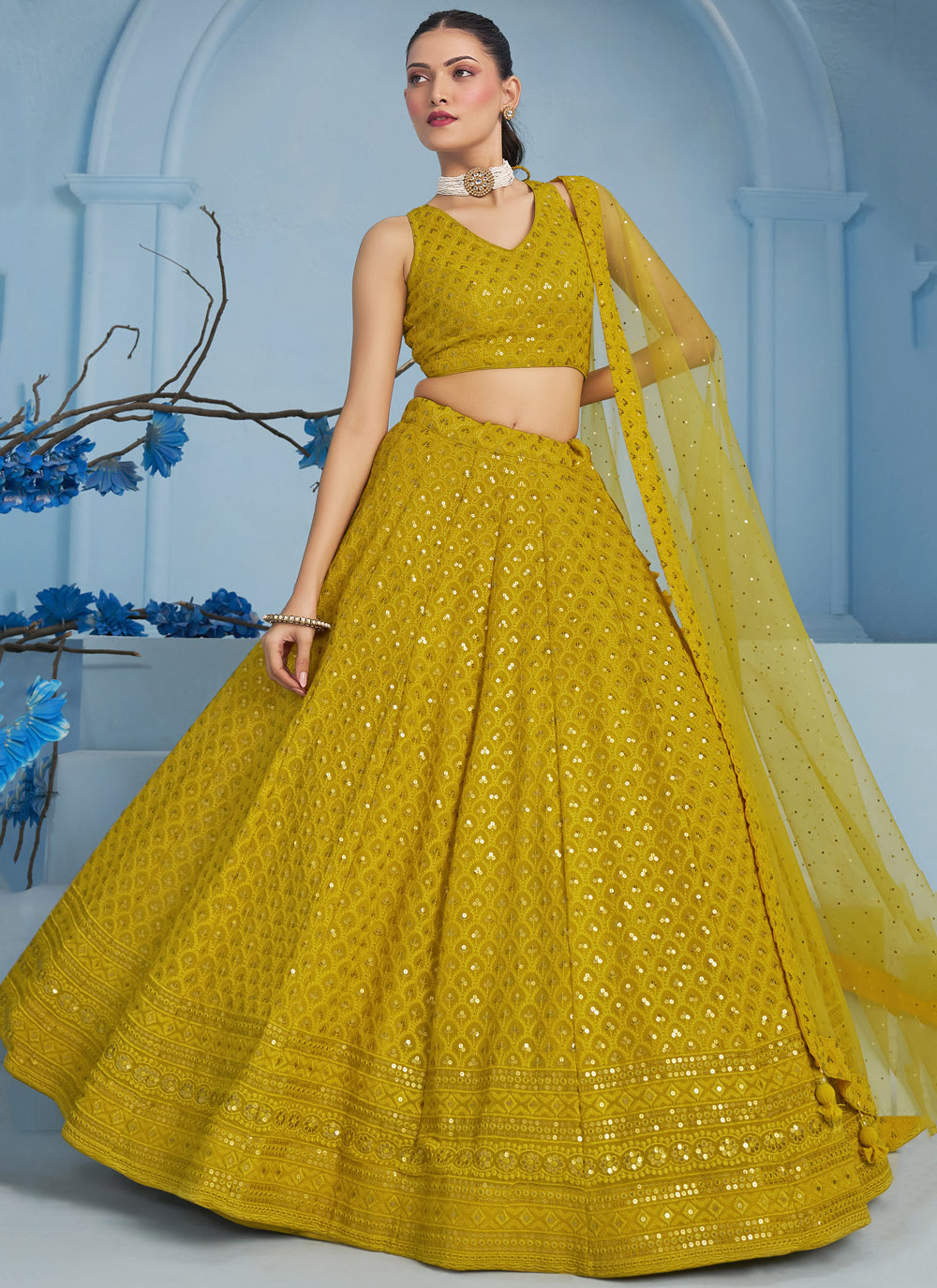 Radiate warmth and joy in this Yellow Georgette Lehenga Choli, finely embroidered with thread and sequins. The bright color and lightweight flow make it ideal for your Haldi celebration, where comfort meets festive flair. Comes with matching choli and dupatta.
