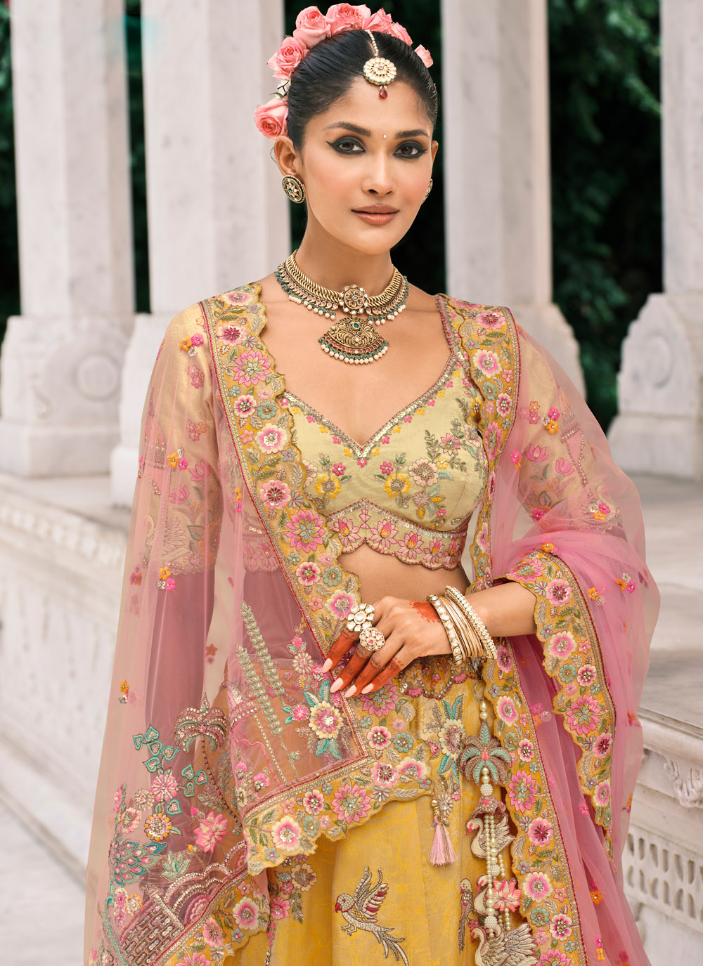 This wedding-ready lehenga choli in cheerful yellow silk combines tradition and contemporary design. Sequins and stone embellishments shimmer beautifully, while zari-thread embroidery adds richness. The designer cut work enhances the outfit’s charm. Comes with matching choli and dupatta.