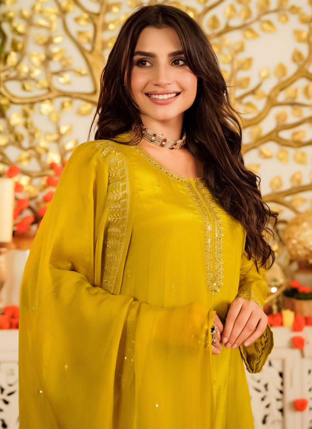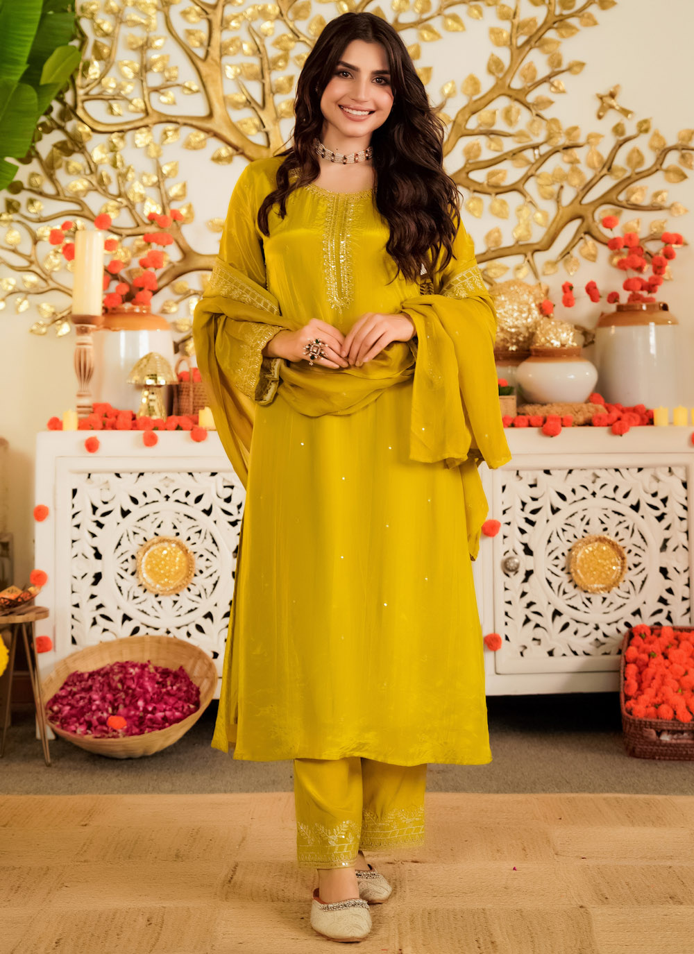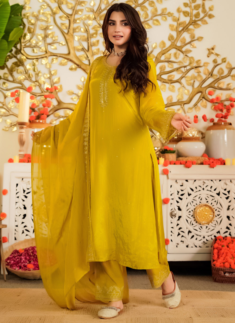 Brighten your ethnic collection with this radiant yellow viscose satin embroidered trendy salwar suit, designed to reflect graceful charm and festive elegance. The smooth satin fabric offers a gentle sheen that enhances its rich appearance. Comes with matching bottom and dupatta.