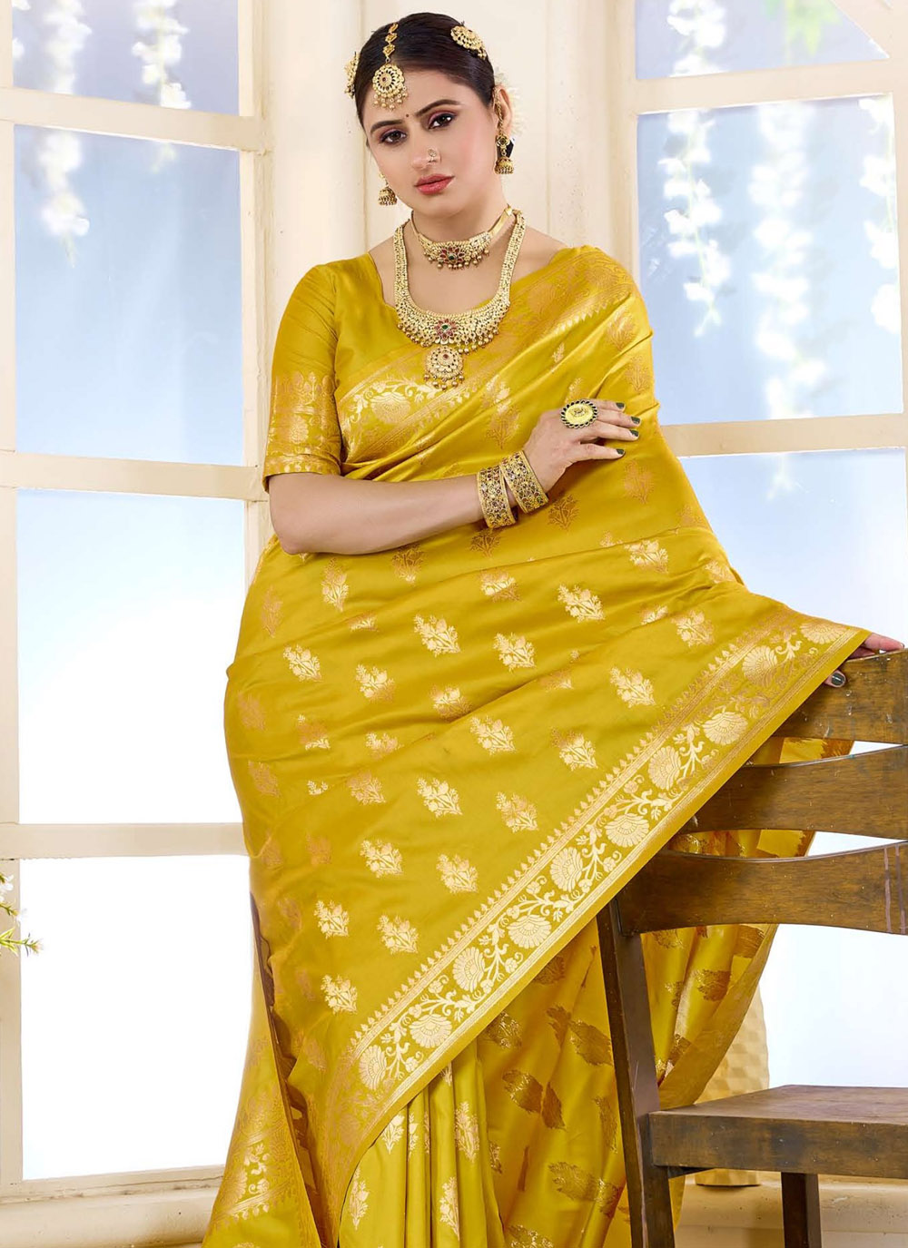 This Yellow Banarasi Silk Saree features exquisite zari weaving work that enhances its graceful and sophisticated appeal. The premium silk fabric drapes beautifully, offering both comfort and elegance. Comes with matching blouse.