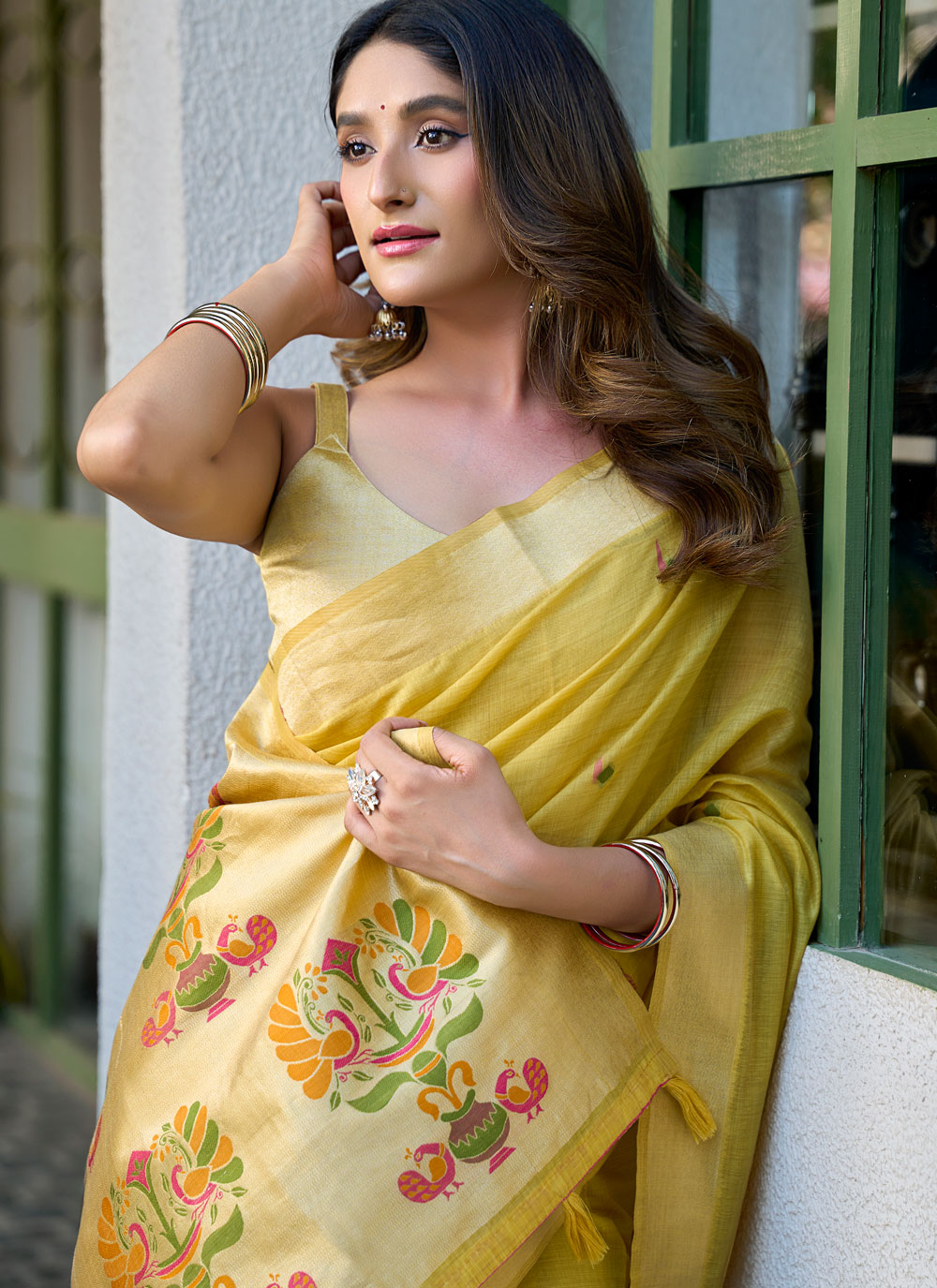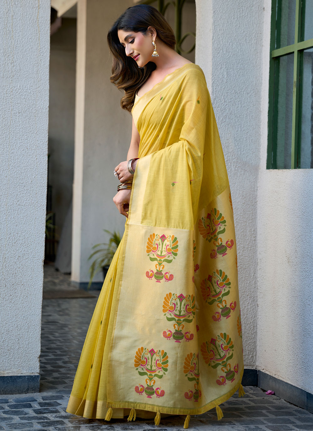 The Yellow Woven Cotton Jacquard Classic Saree blends traditional craftsmanship with modern comfort. The breathable cotton fabric keeps you relaxed, while the elegant woven patterns highlight fine artistry. Comes with matching blouse.