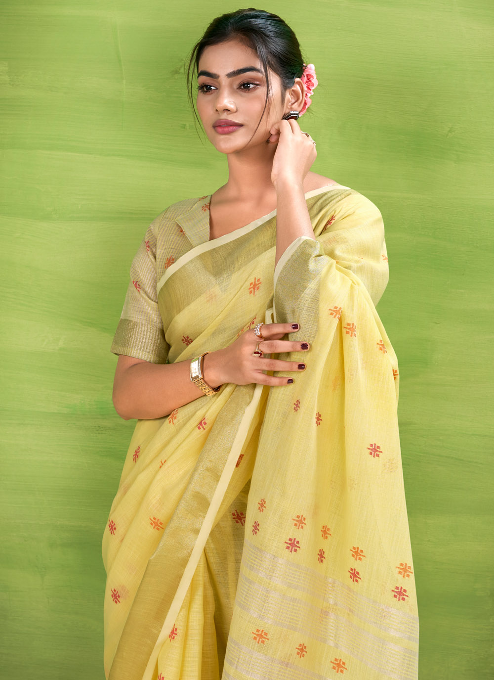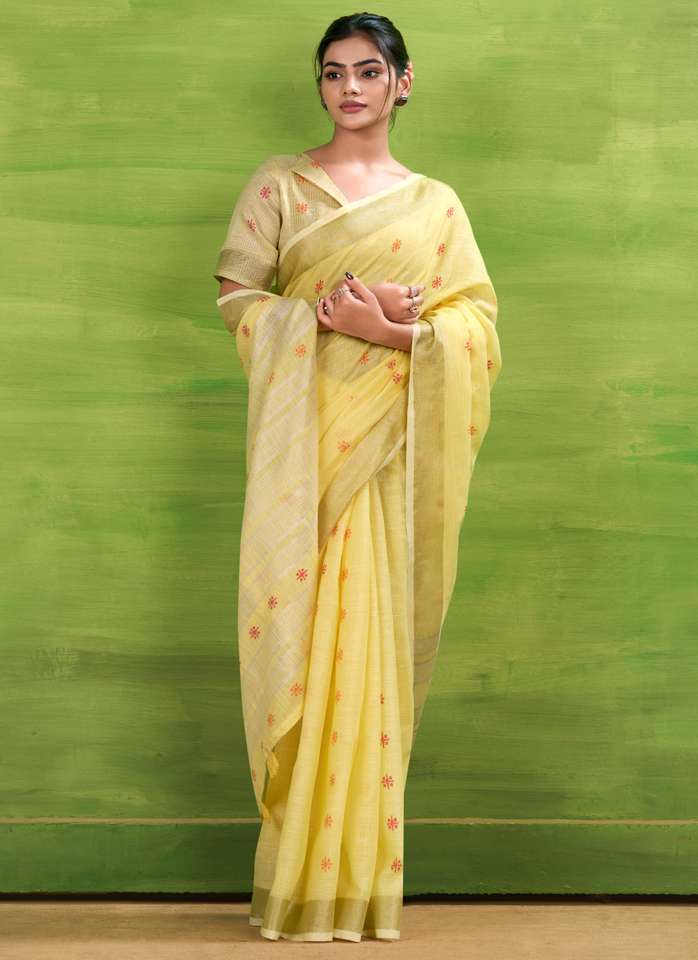This saree in bright yellow linen is enhanced with zari weaving that creates a beautiful balance of simplicity and elegance. Designed for casual occasions, it offers both comfort and timeless style. Comes with matching blouse.