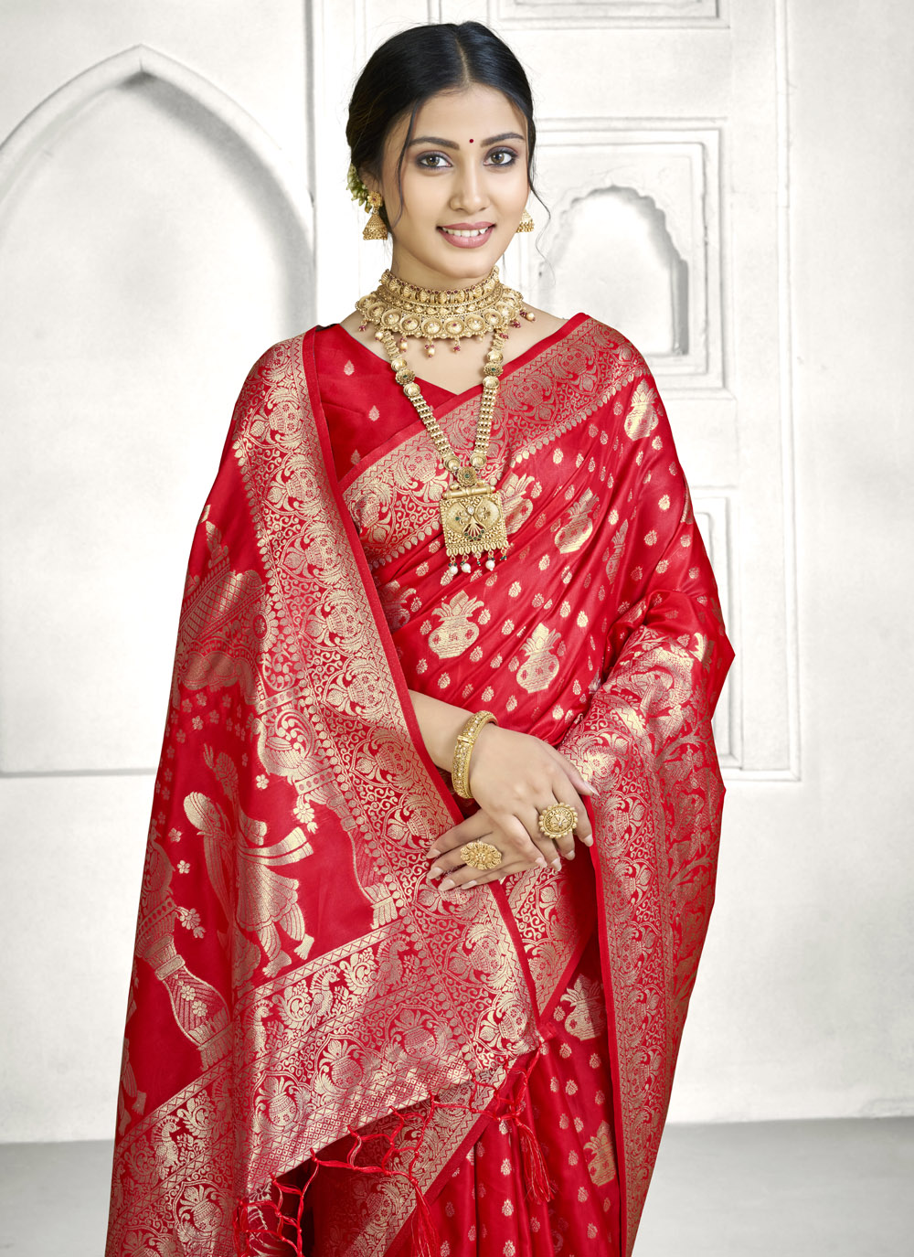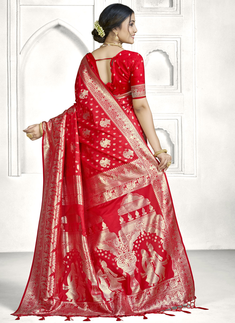 Celebrate festivals in traditional style with this red Banarasi silk saree woven with fine zari work. The classic pattern and vibrant color offer a perfect blend of tradition and sophistication. Comes with matching blouse.