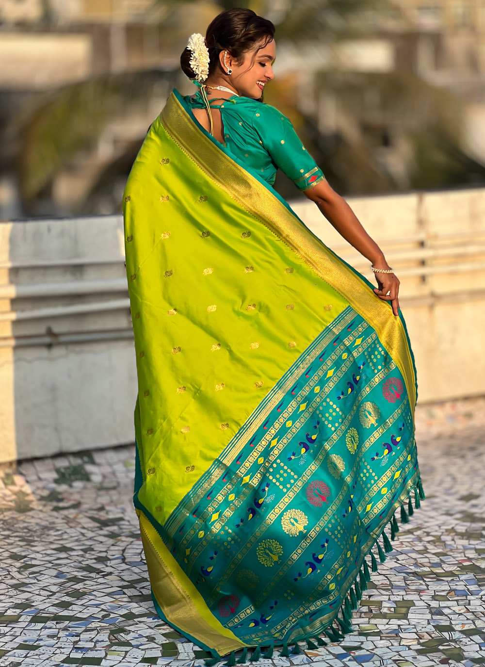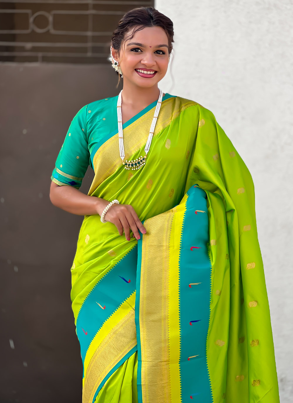 This Designer Green Silk Saree is adorned with fine zari weaving that reflects India's rich weaving traditions. A stunning combination of color and craftsmanship, it is perfect for women who prefer traditional aesthetics with a designer edge. Comes with matching blouse.