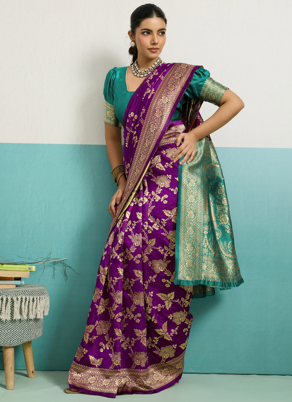 Add a touch of royal elegance to your wardrobe with this purple Banarasi silk saree designed with intricate zari weaving. The rich silk texture enhances its luxurious appearance, while the stylish purple color creates a striking and refined look. Comes with matching blouse.
