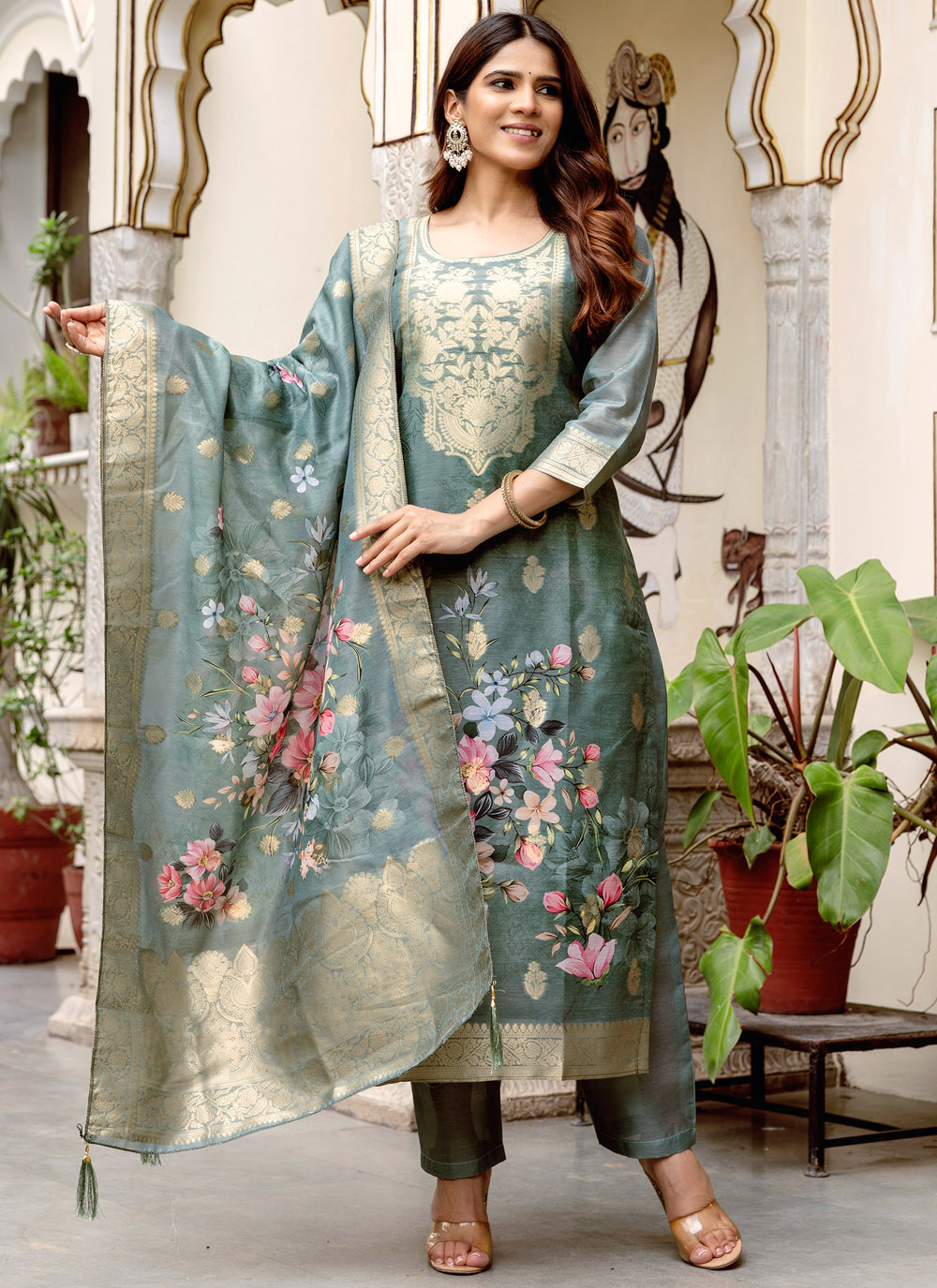 Gery Chanderi Cotton Printed and Woven Readymade Salwar Suit