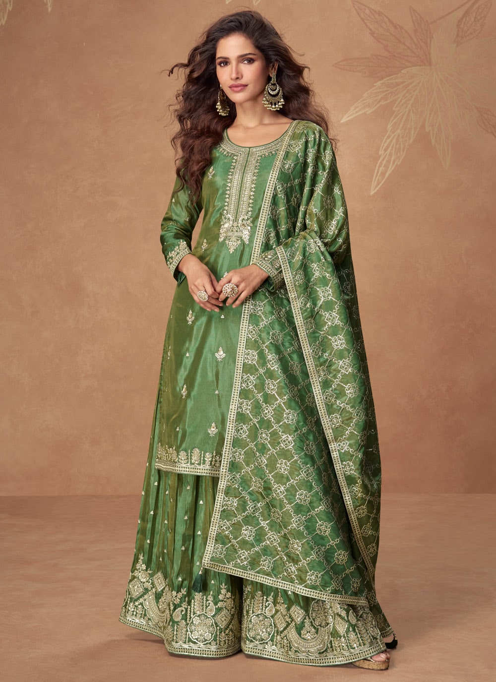 Embroidered Sea Green Chinon Palazzo Style Salwar Kameez