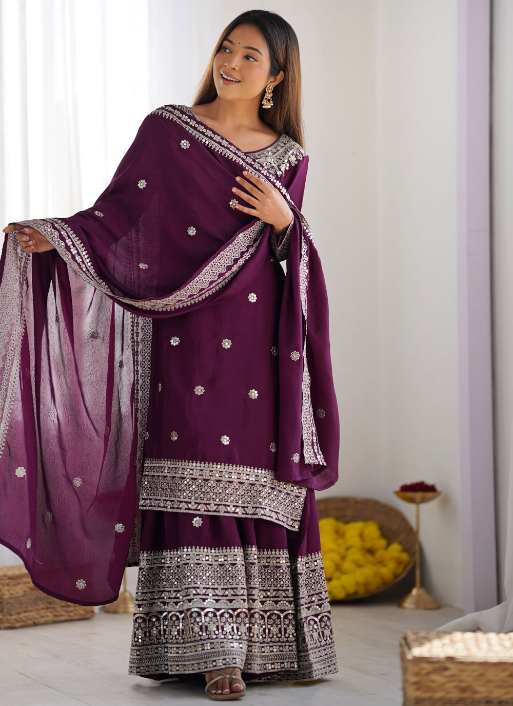 Purple Chinon Sequins Embroidered Readymade Salwar Suit