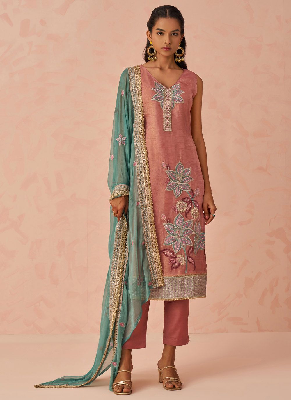 Pink Chinon Zari Embroidered Designer Palazzo Salwar Kameez