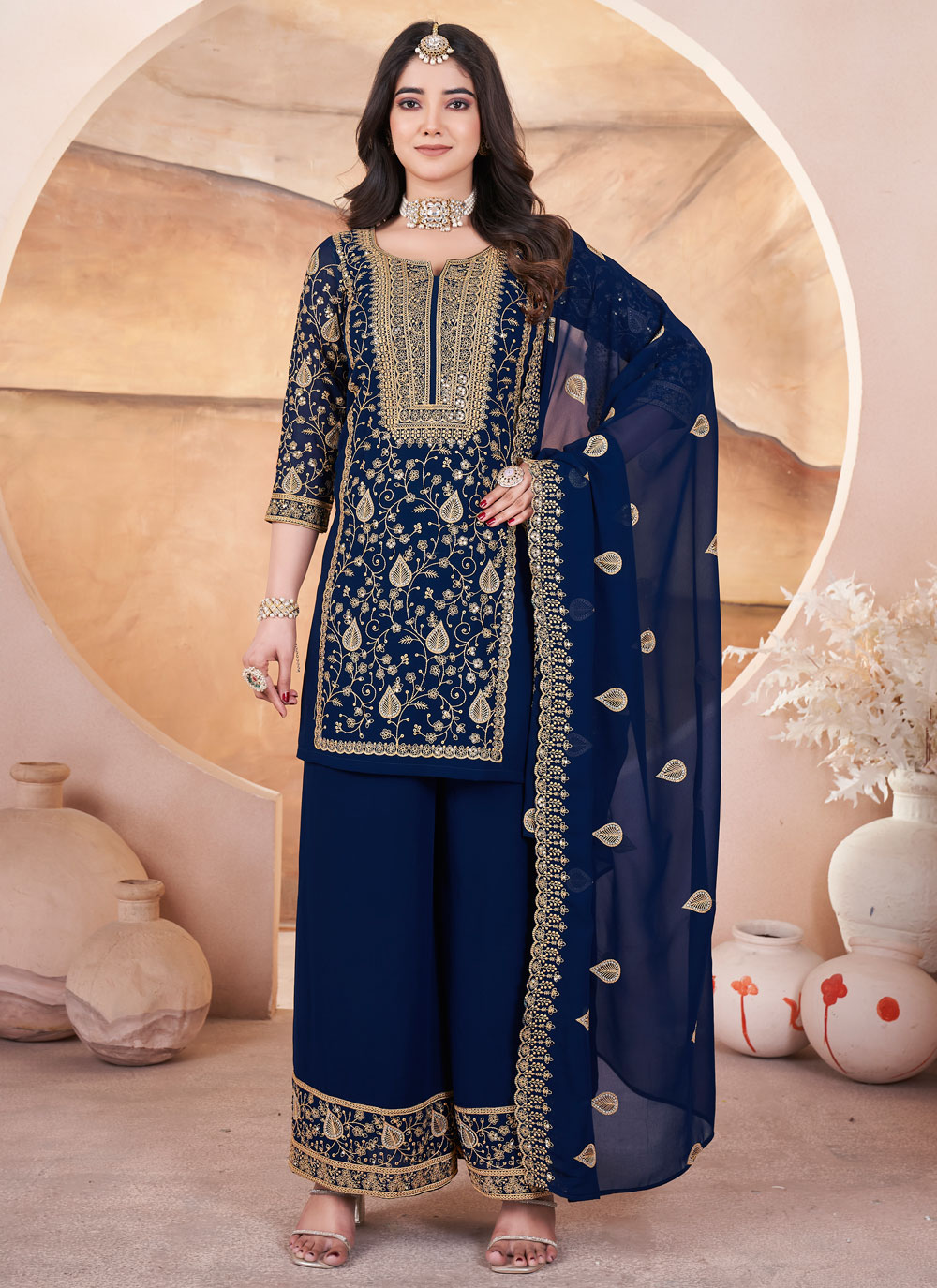 Navy Blue Georgette Embroidered Readymade Suit