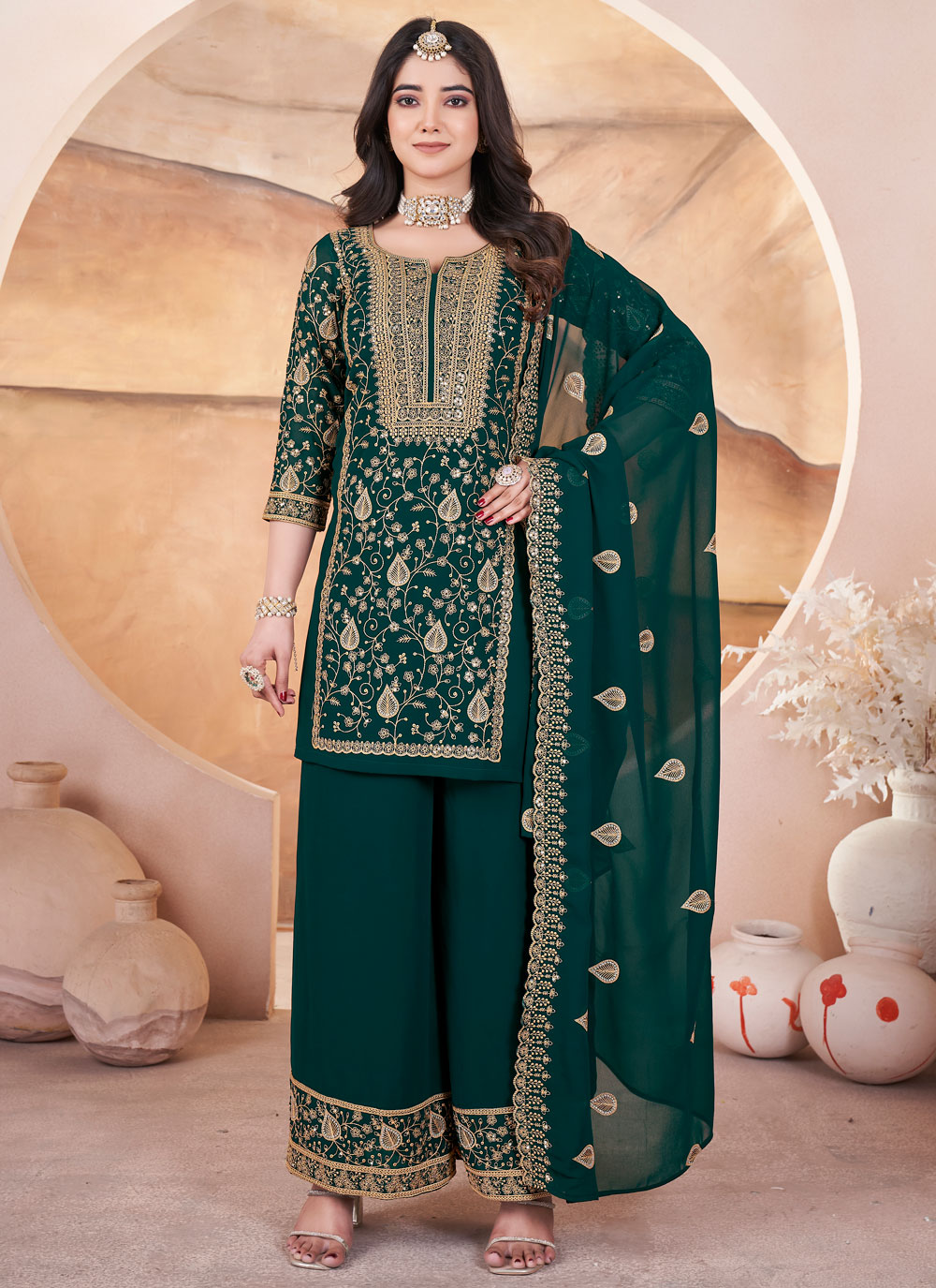 Green Georgette Embroidered Sequins Readymade Salwar Kameez