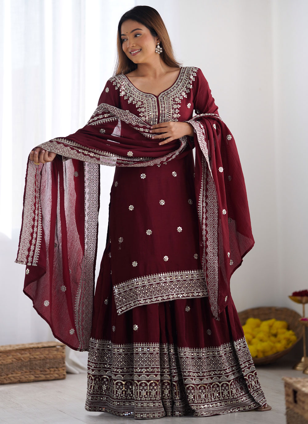 Chinon Silk Embroidered Sequins Wine Salwar Kameez
