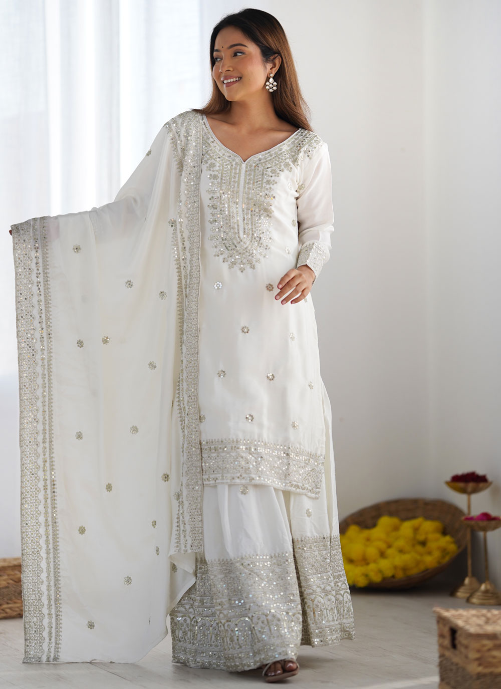 White Chinon Silk Embroidered Sequins Palazzo Salwar Kameez