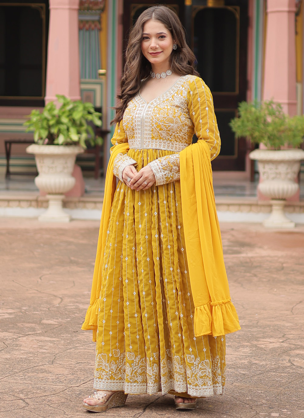 Yellow Faux Georgette Thread Embroidered Readymade Palazzo Salwar Suit