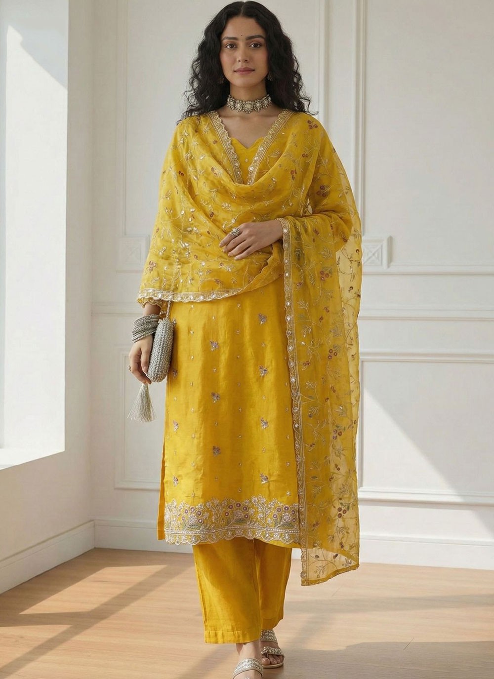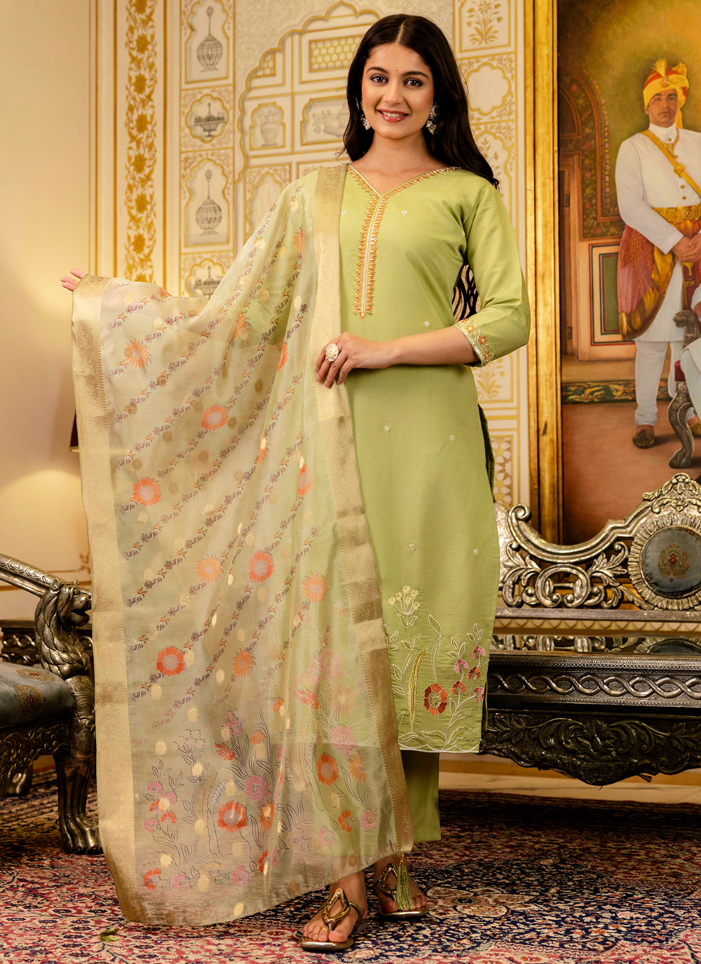 Organza Sea Green Embroidered Readymade Pant Style Salwar Suit