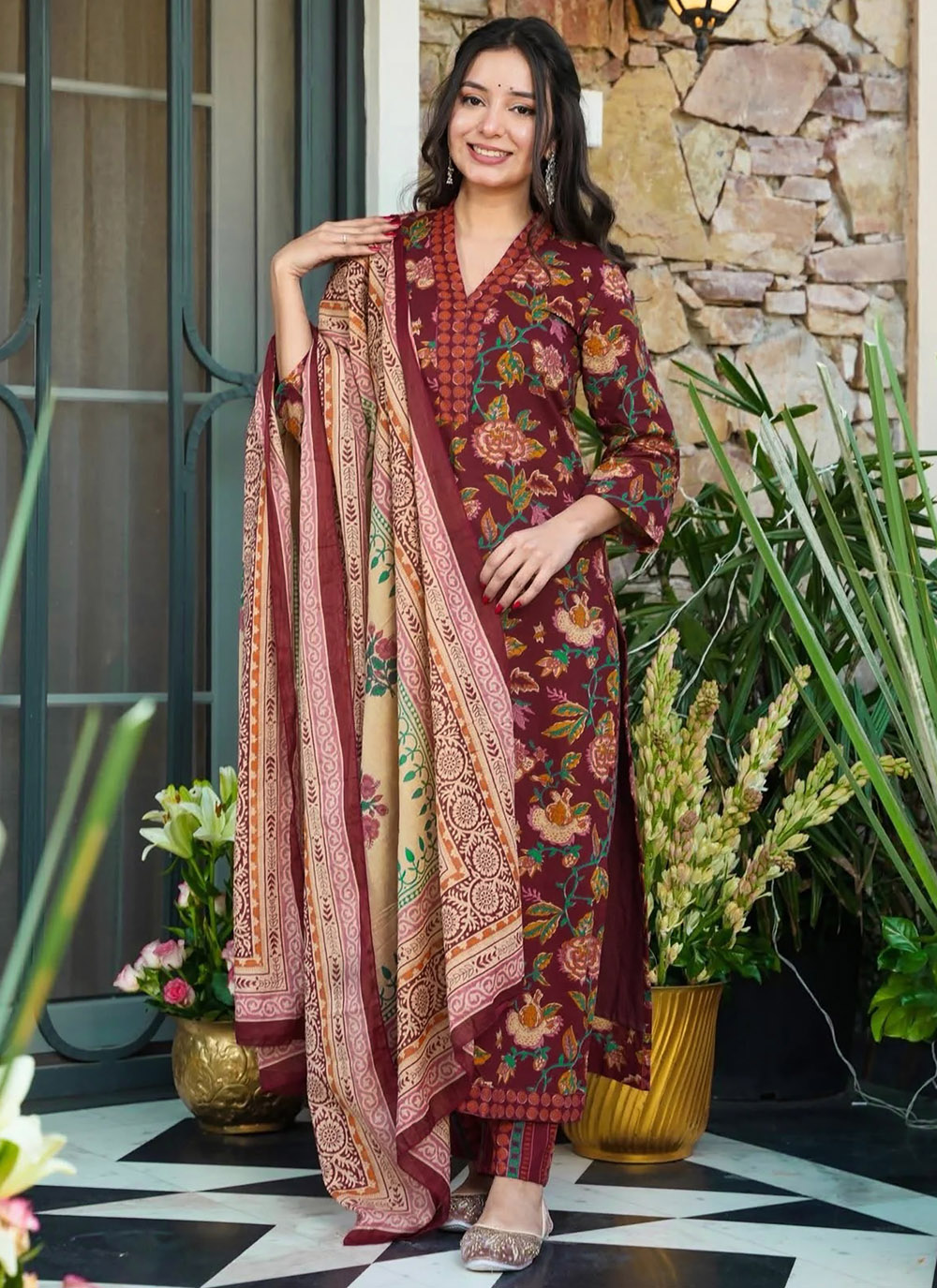 Muslin Maroon Salwar Kameez With Digital Print Work