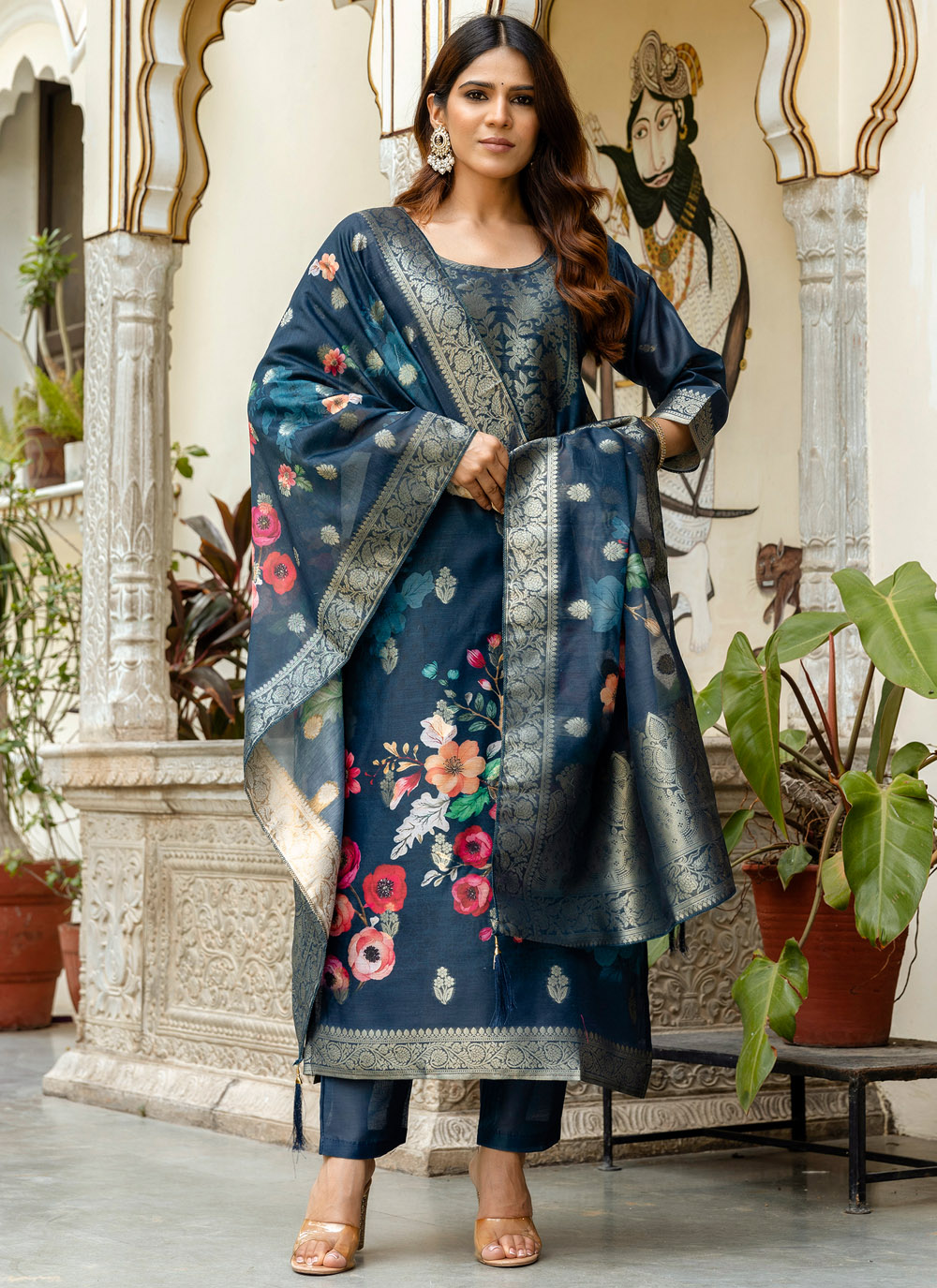 Chanderi Cotton Woven and Printed Navy Blue Salwar Suit