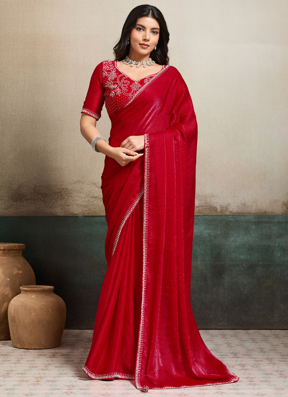 Red Satin Chiffon Embroidered Border Work Traditional Saree