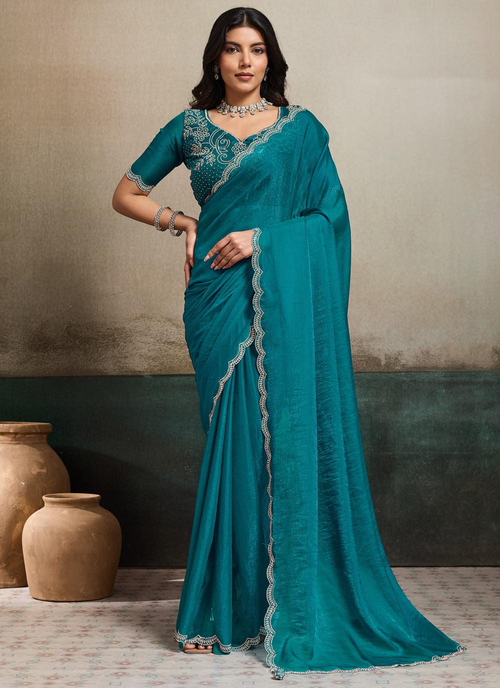 Rama Chiffon Satin Border Embroidered Work Classic Saree