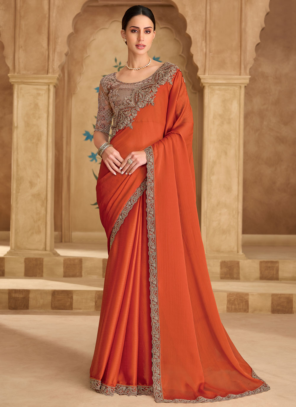 Velvet Chiffon Orange Border Embroidered Contemporary Saree