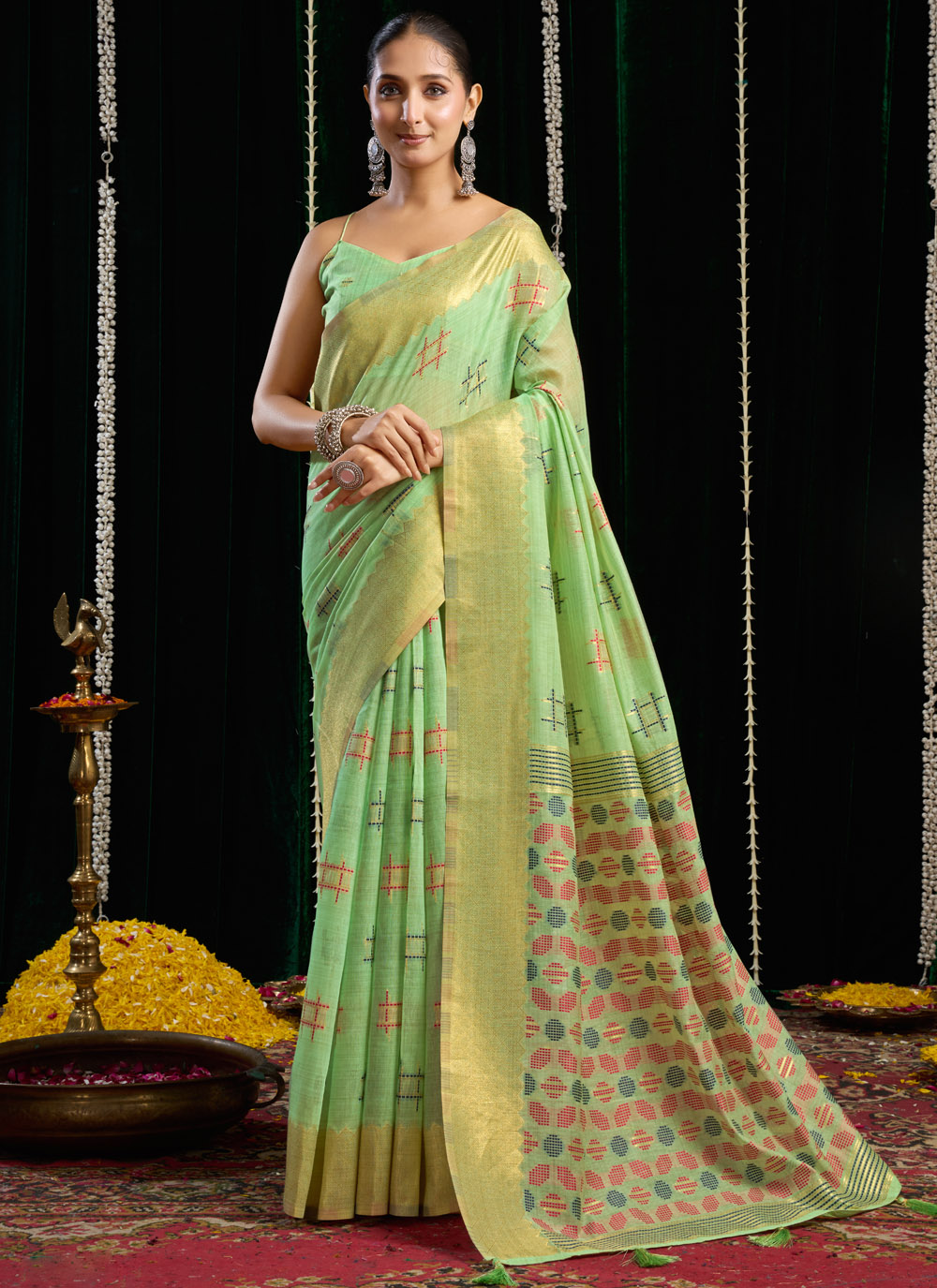 Green Cotton Plain Festival Wear Saree
