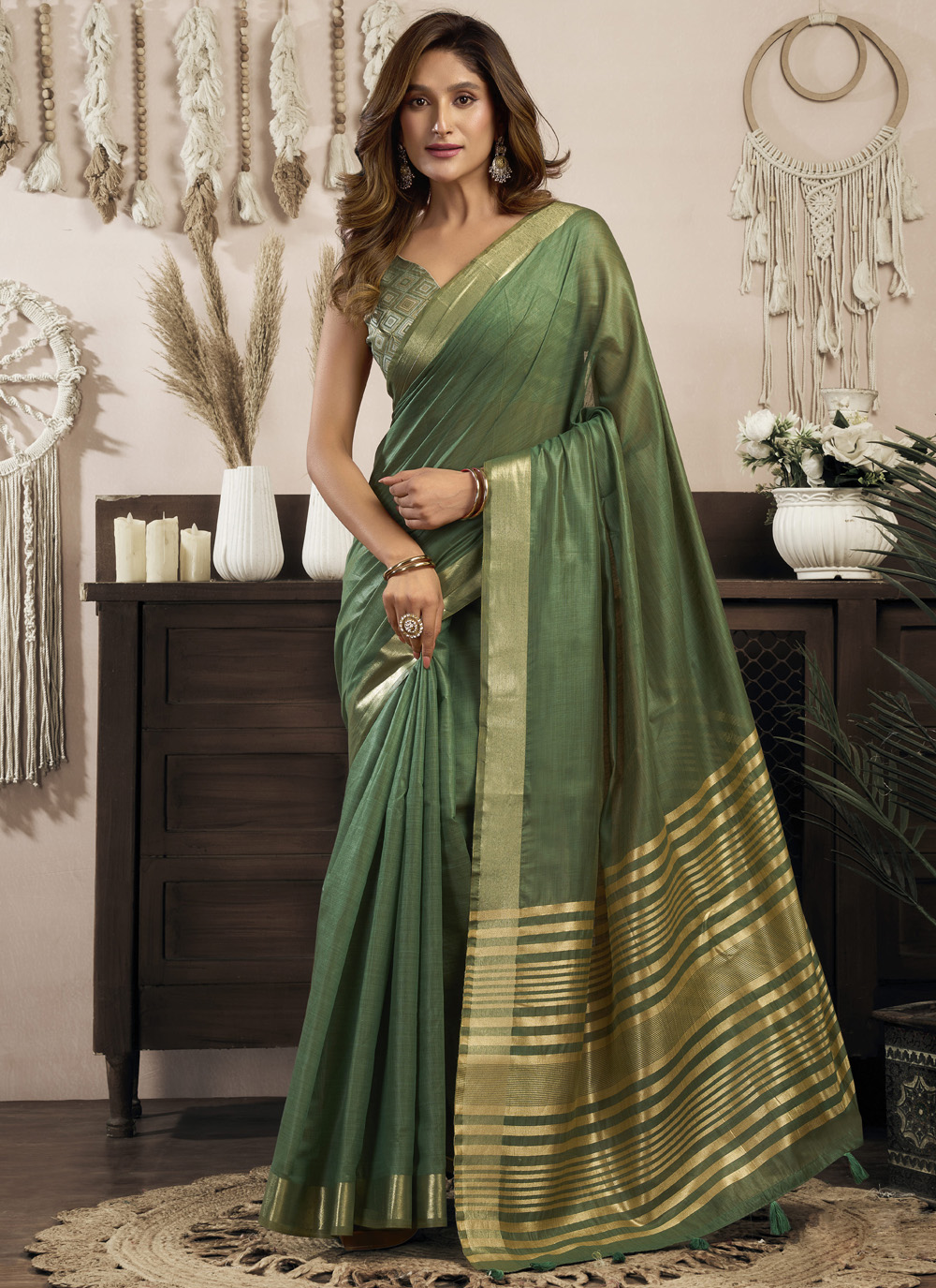 Plain Traditional Green Cotton Saree