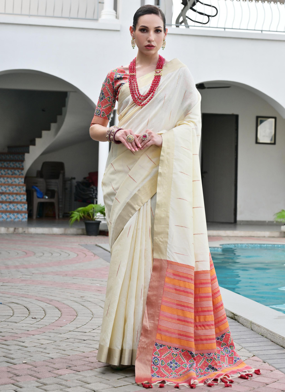 Cream Digital Printed Silk Contemporary Saree