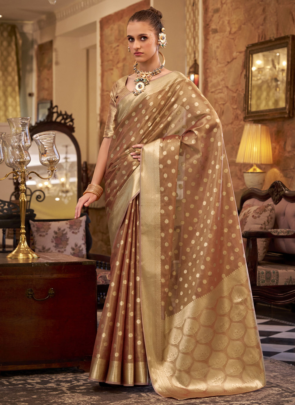 Brown Tissue Silk Zari Work Traditional Saree