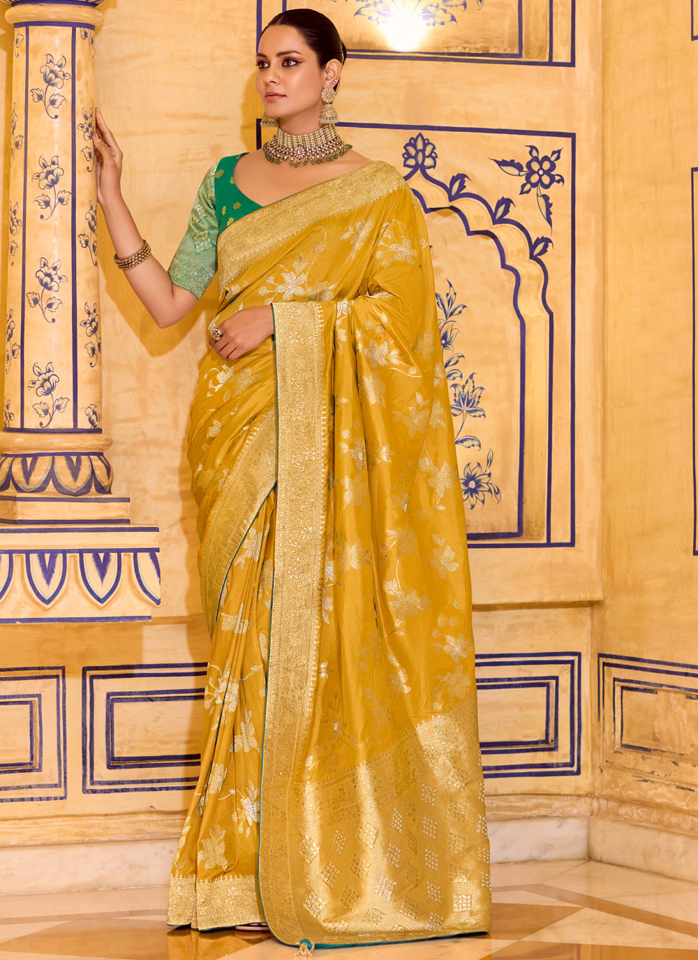 Jimmy Chu Mustard Traditional Saree with Embroidery Work