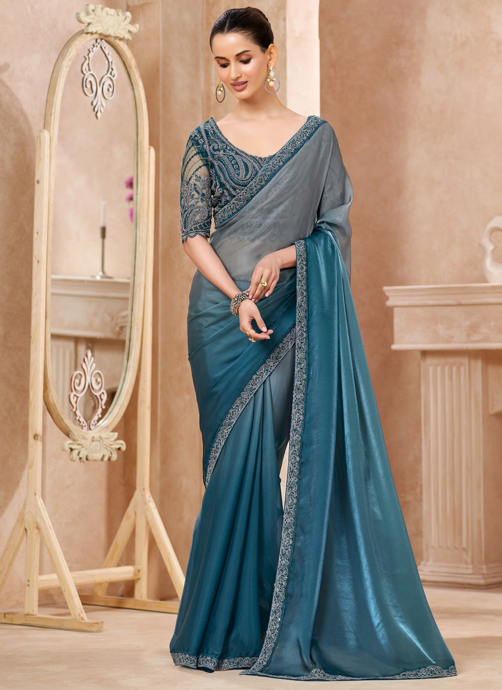 Teal Border Work Fandy Contemporary Saree for Reception