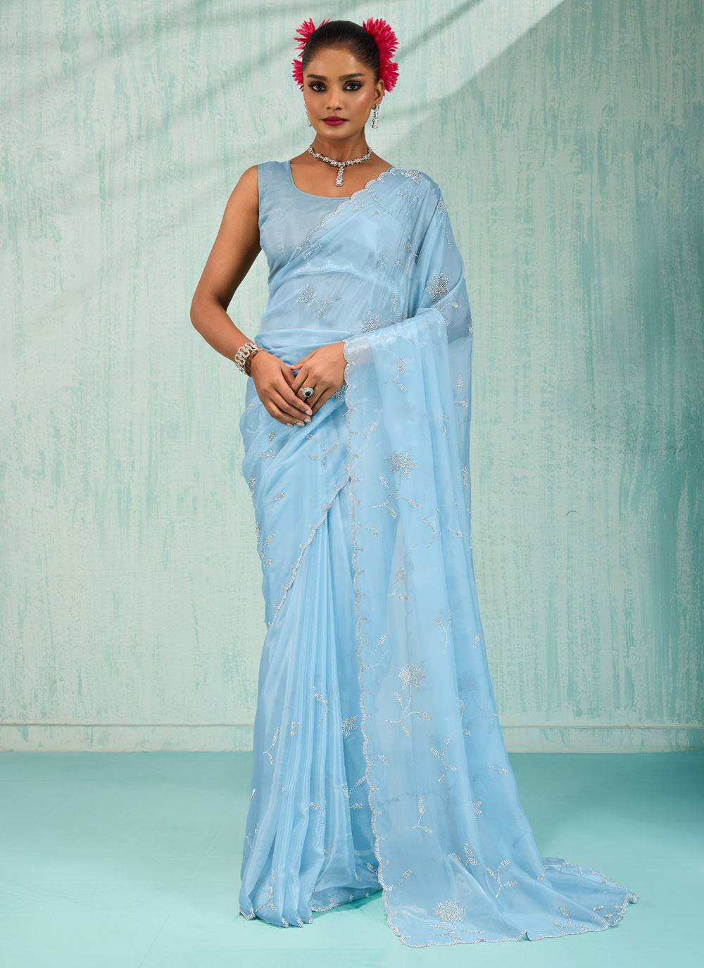 Yellow Georgette Foil Print and Lucknowi Work Saree