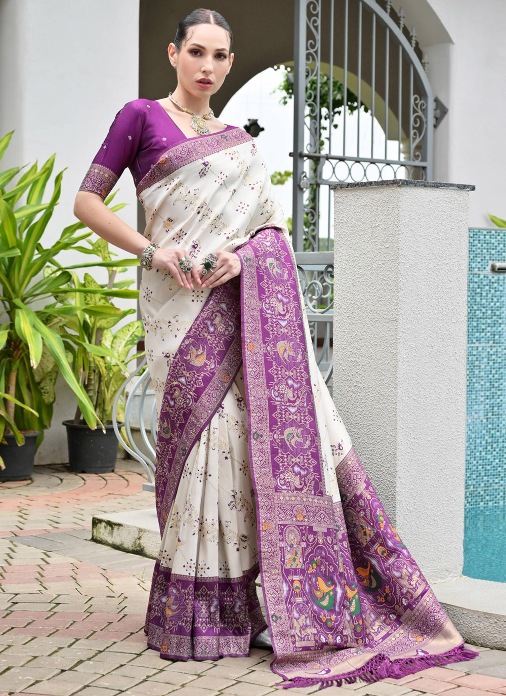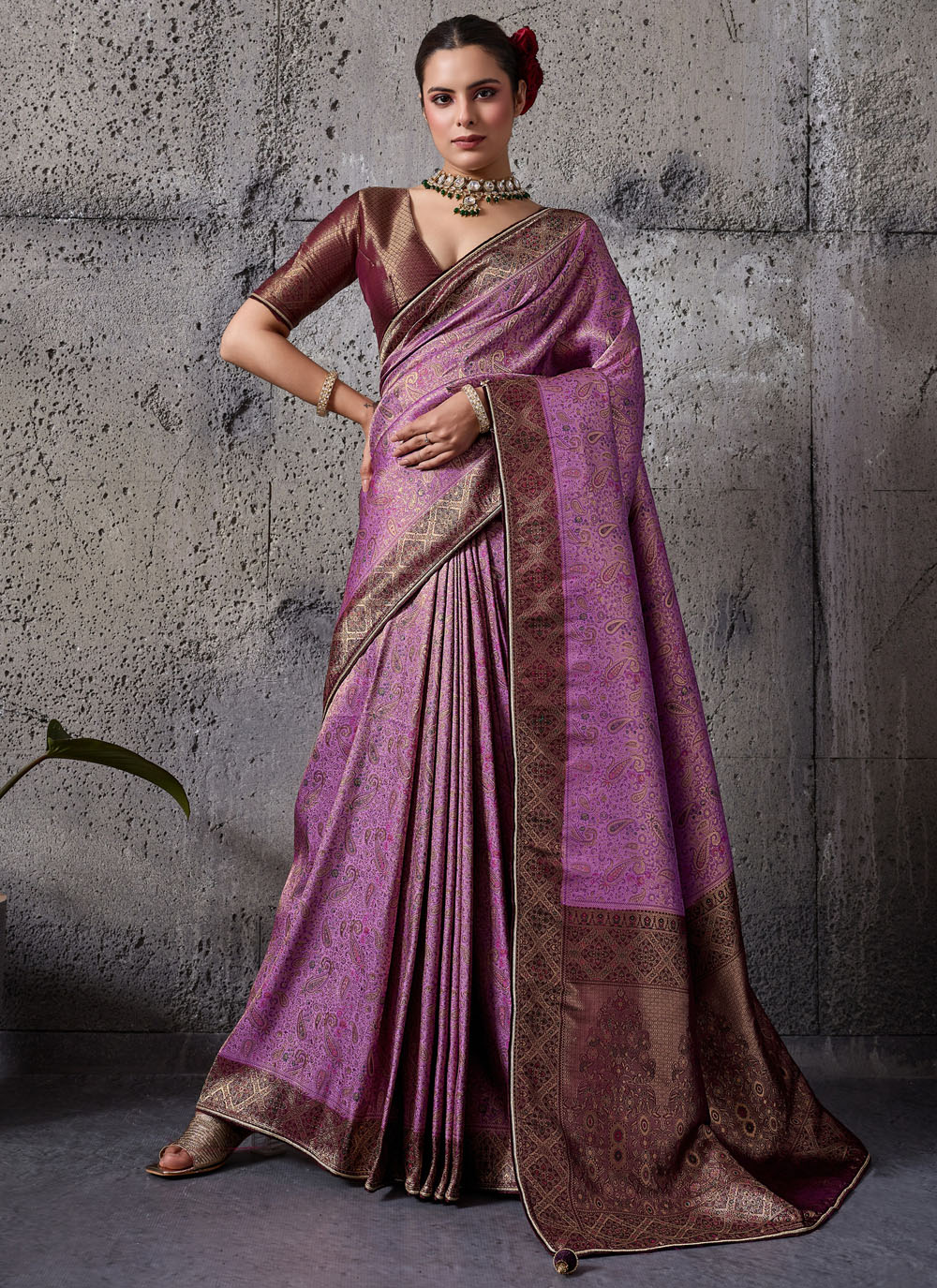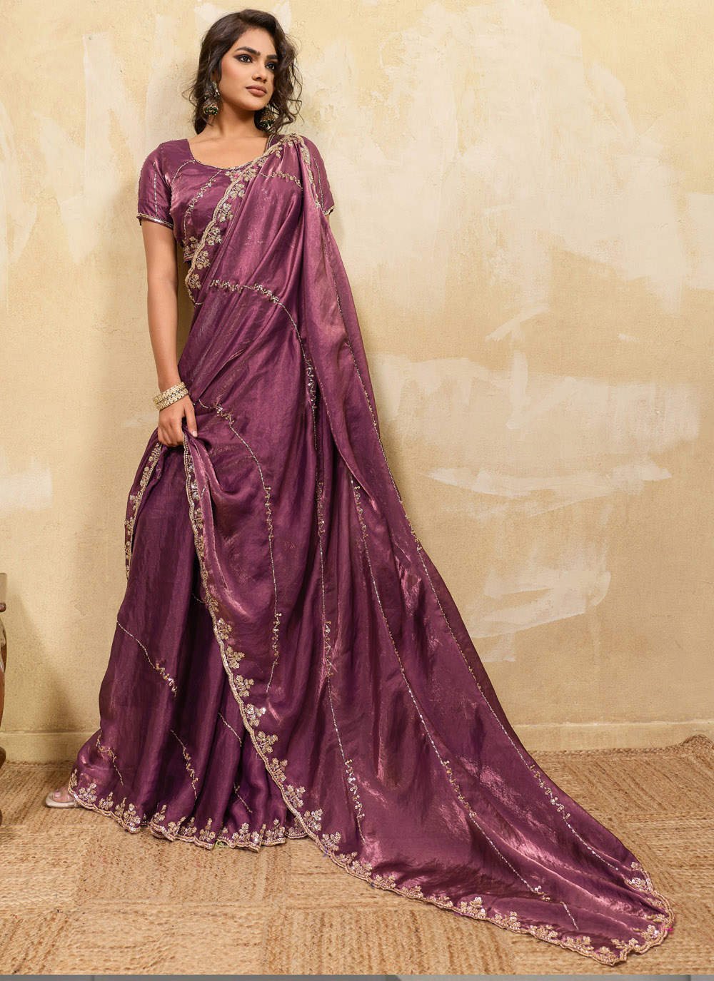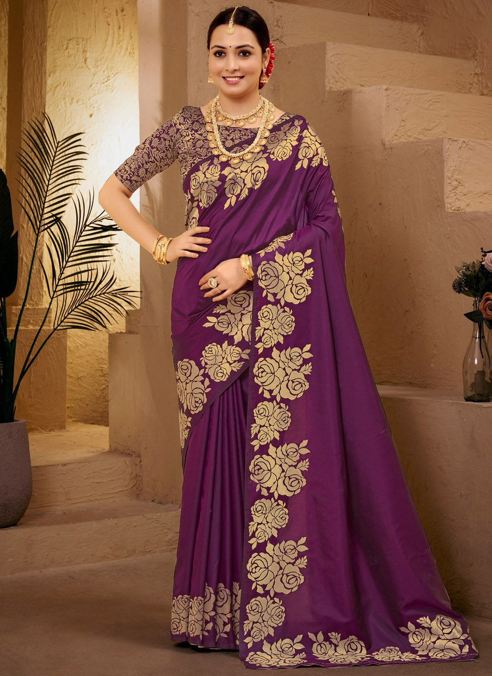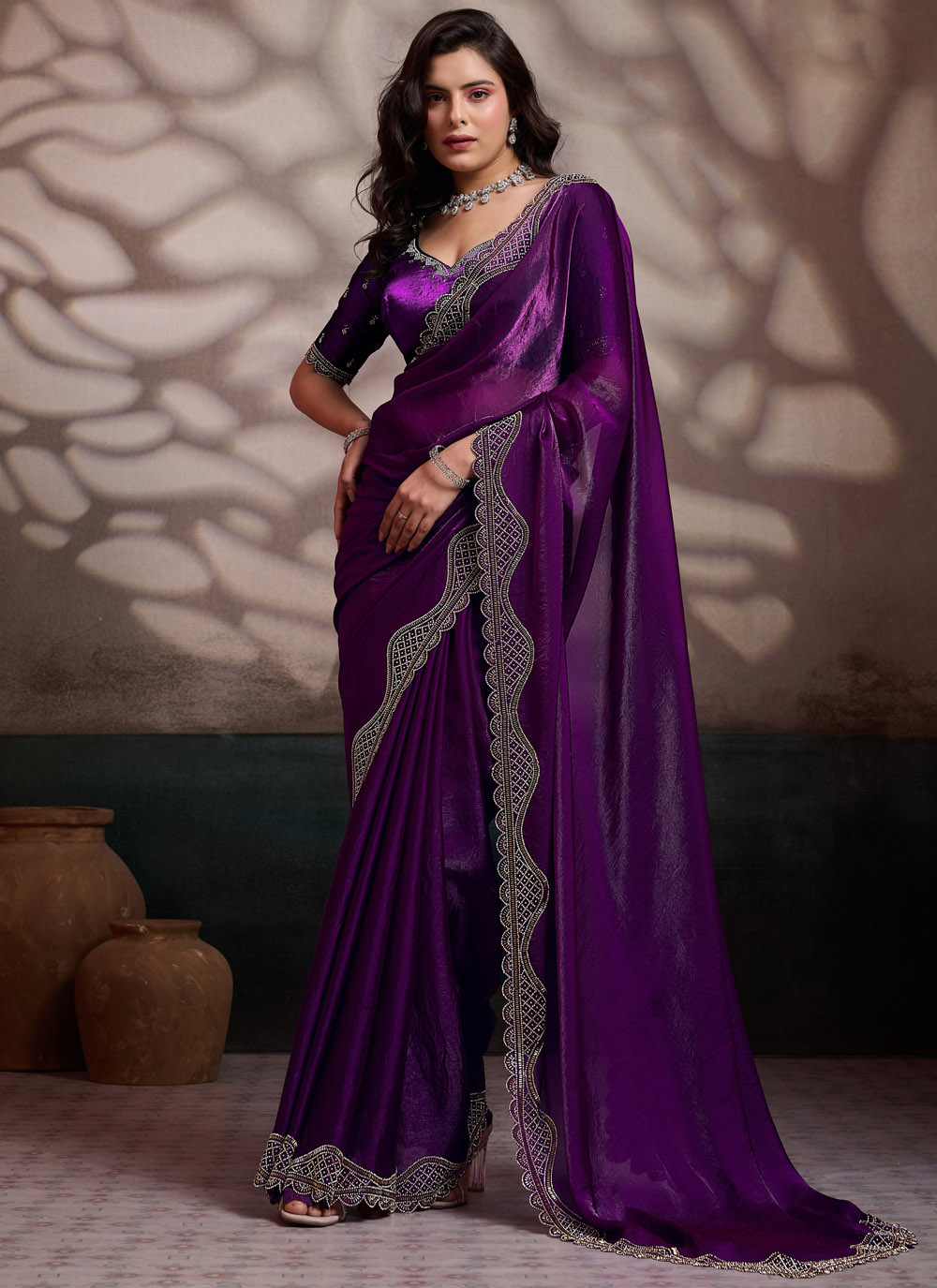 Purple Chiffon Satin Border Embroidered Traditional Saree