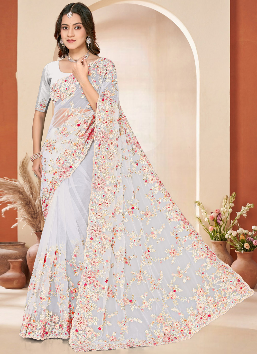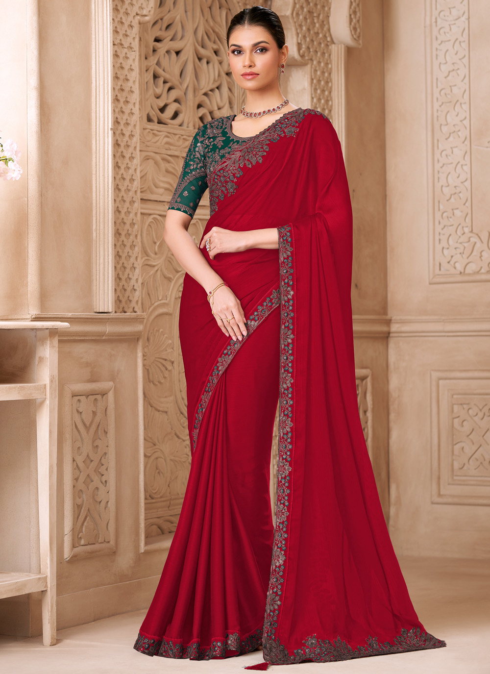 Grey Shimmer Satin Embroidered Border Work Saree for Festival