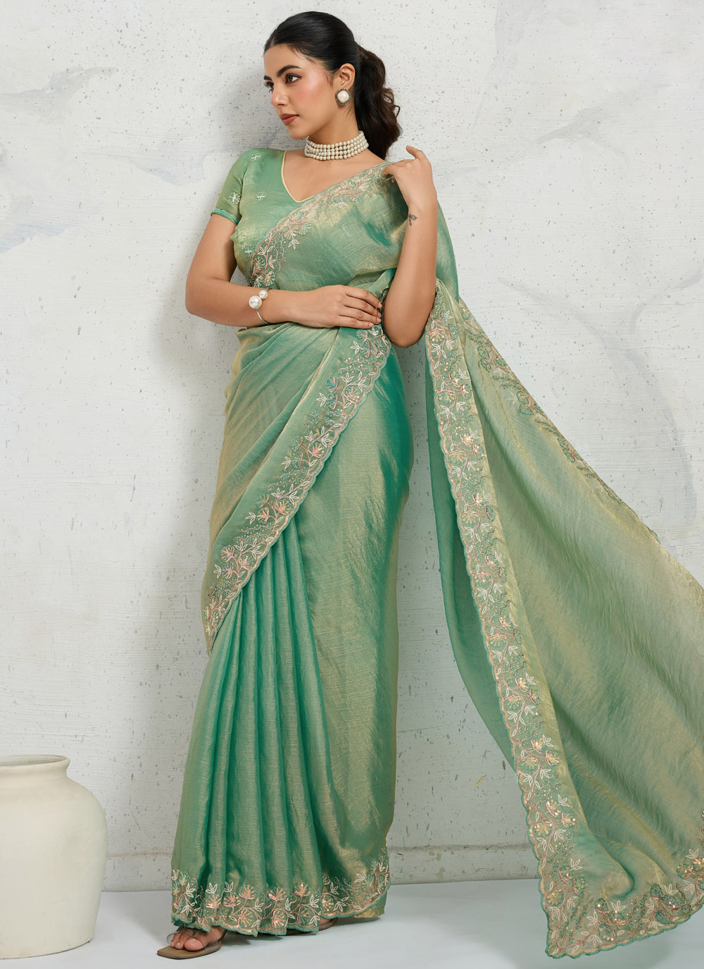 Green Embroidered Border Chiffon Velvet Classic Saree